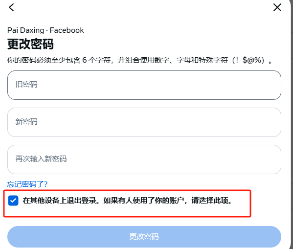 修改密码后,Facebook会询问是否需要将其他设备上的账号退出登录: